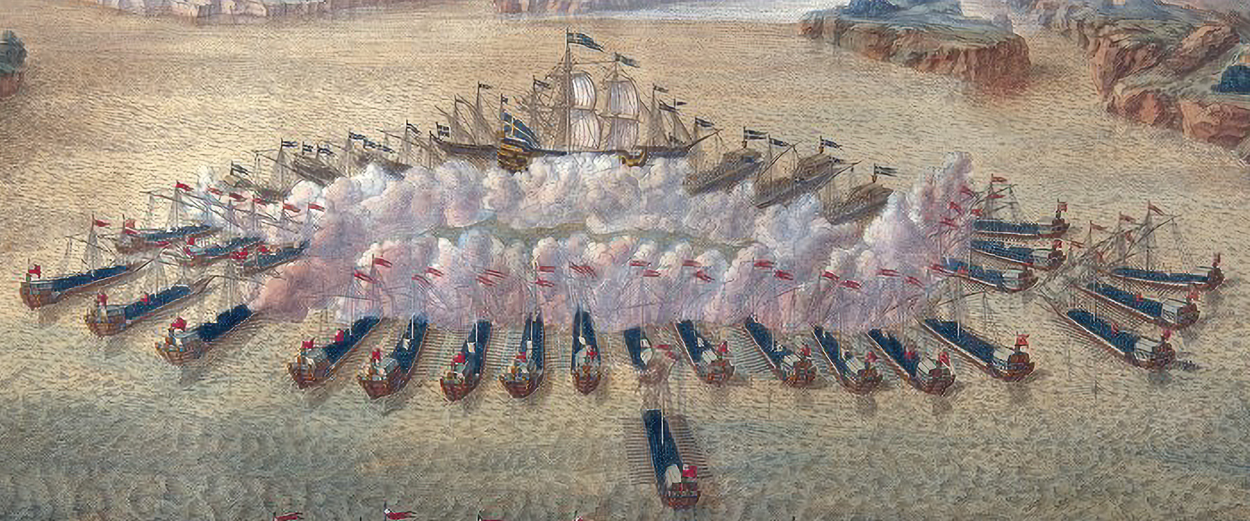 The Swedish fleet under Rear Admiral Nils Ehrenskjold had them bottled up in the Gulf of Finland, and the Russians were determined to break through. Ehrenskjold, greatly outnumbered by the 100-galley Russian fleet, made use of the narrow channel to array his ships broadside to the foe. So while the Russians had the advantage in numbers, the Swedish had the advantage in position—one that cramped the efforts of the enemy ships.